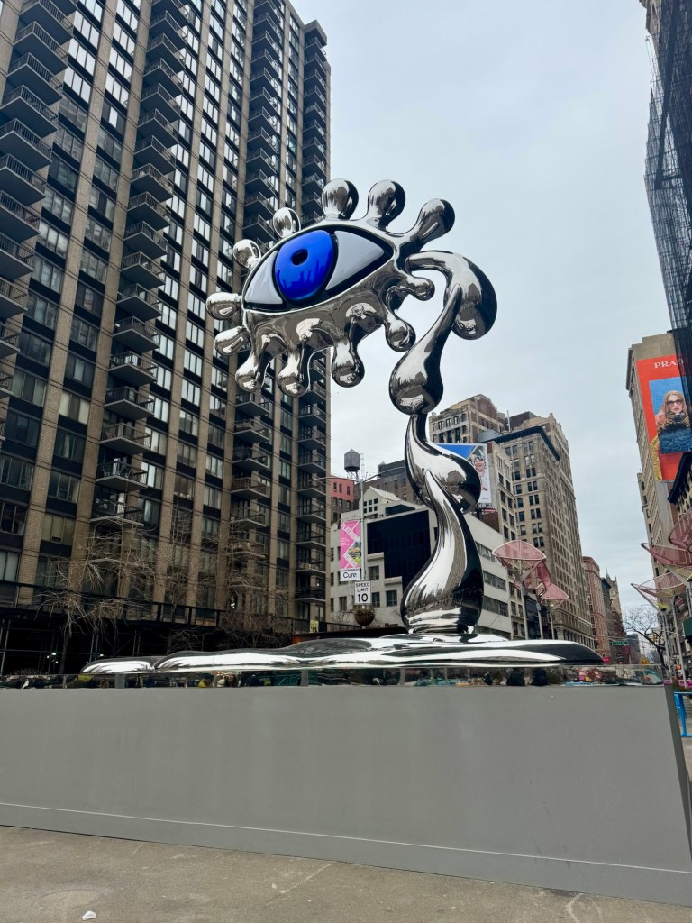 The next day, we slowed it down and explored. We went to find the giant chrome evil eye sculpture at Flatiron Plaza by Charlotte Colbert. It was 10 feet tall, reflecting everything around it. Blue and brown eyes, layered behind each other. Honestly? Beautiful. I love art in all forms whether it’s in a museum or just out in the street.